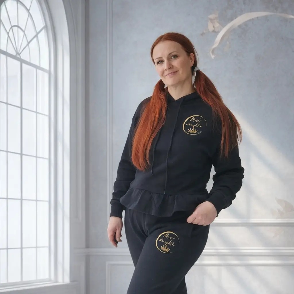 Ekologinen materiaali yhdistyy mukavuuteen ja urheilullisuuteen samalla kun housujen lahkeen yläosassa oleva kullanvärinen logo King´s Daughter - Kuninkaan tytär kertoo tarinaa sinun ainutlaatuisesta arvostasi Jumalan silmissä.